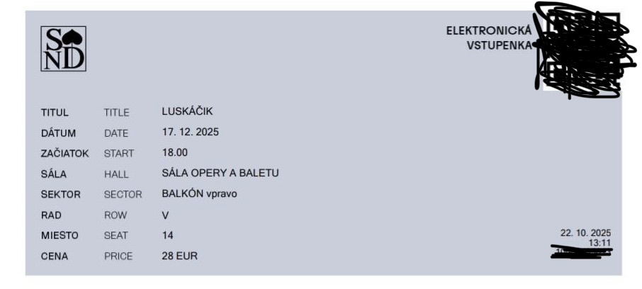 Predavam 2ks listkov do SND na baletné predstavenie Luskáčika v stredu 17.12.2025. Sektor na balkóne. Po prijatí platby Vám lístok pošlem obratom na e-mail.