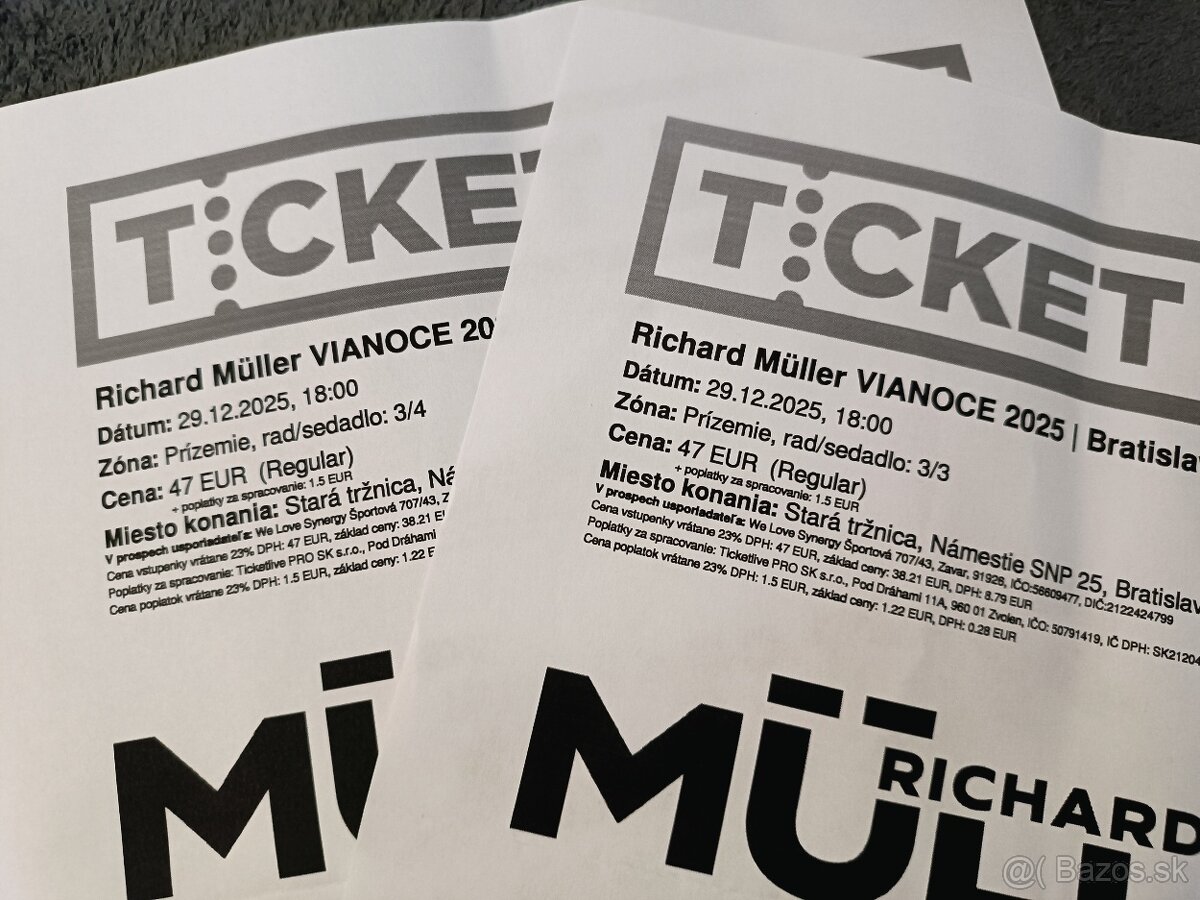 Richard Muller - [25.12. 2025]Dobrý deň predám 2 ks vstupenky na koncert Richard Muller 28.12.2025 Bratislava. Cena za obe vstupenky 80 €.