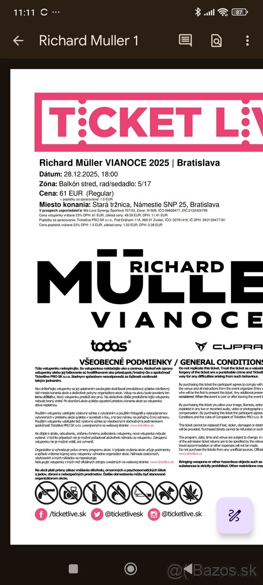 Richard Müller - [25.12. 2025]Predám prípadne vymením za iný dátum 2 lístky na koncert Richarda Müllera podrobnosti na foto