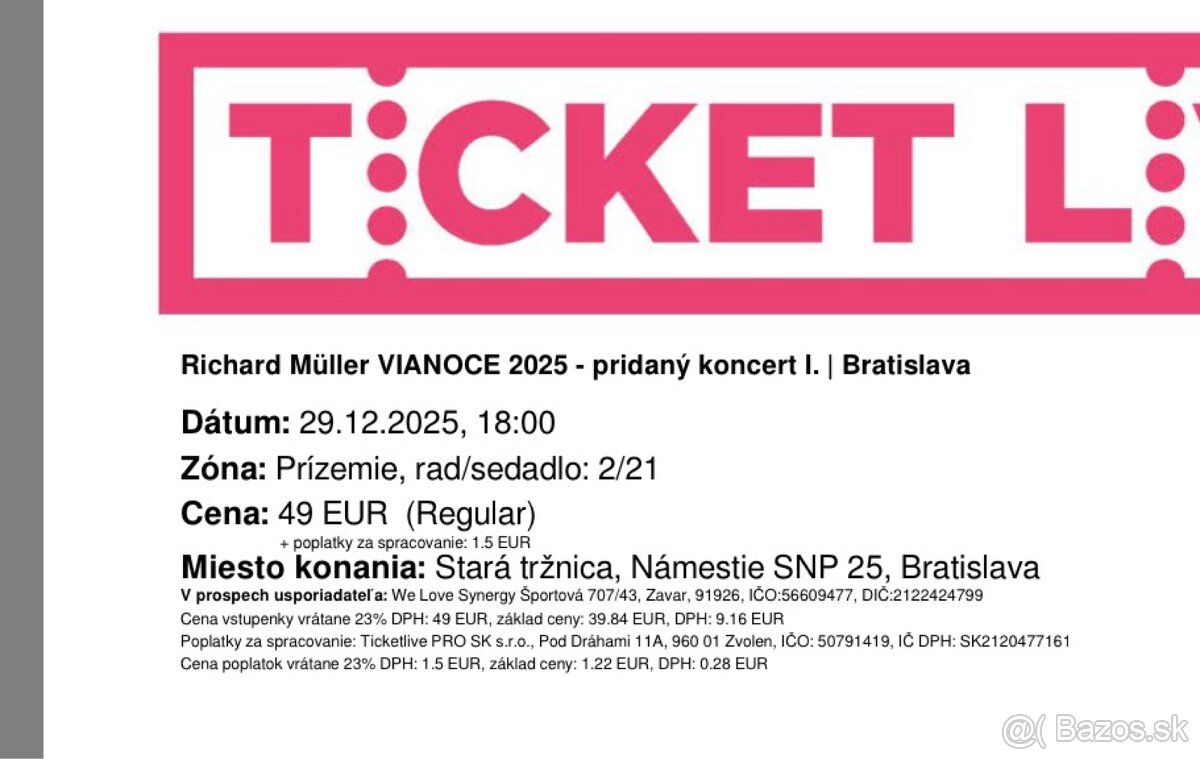 Richard Muller Vianoce 29.12.2025 o 18.00h - [28.12. 2025]Predam 1 listok na sedenie (rad 7/ sedadlo 38) na pridany koncert Richard Muller Vianoce 29.12.2025 o 18.00h v Starej trznici. Original cena 49€. Odovzdanie osobne pred koncertom.