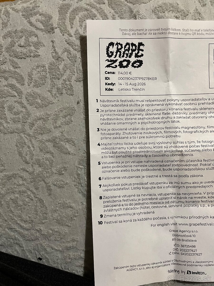GRAPE festival 2026 - [11.2. 2026]Predávam lístok na GRAPE festival 2026 z predpredaja. Kvôli dovolenke sa ho nemôžem zúčastniť. PÍŠTE MAIL