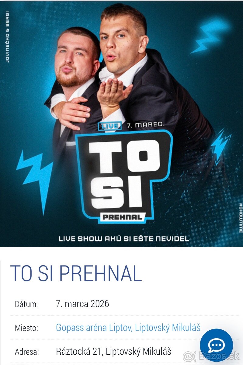Predám dva lístky na live show Jovinecka a Bergiho - TO SI PREHNAL 7.3. v Liptovskom Mikuláši. Nemôžem sa zúčastniť z dôvodu úrazu preto predávam. Cena 1 lístku bola 29€. Predám oba za 45€. Pri rýchlom jednaní možná dohoda na cene.