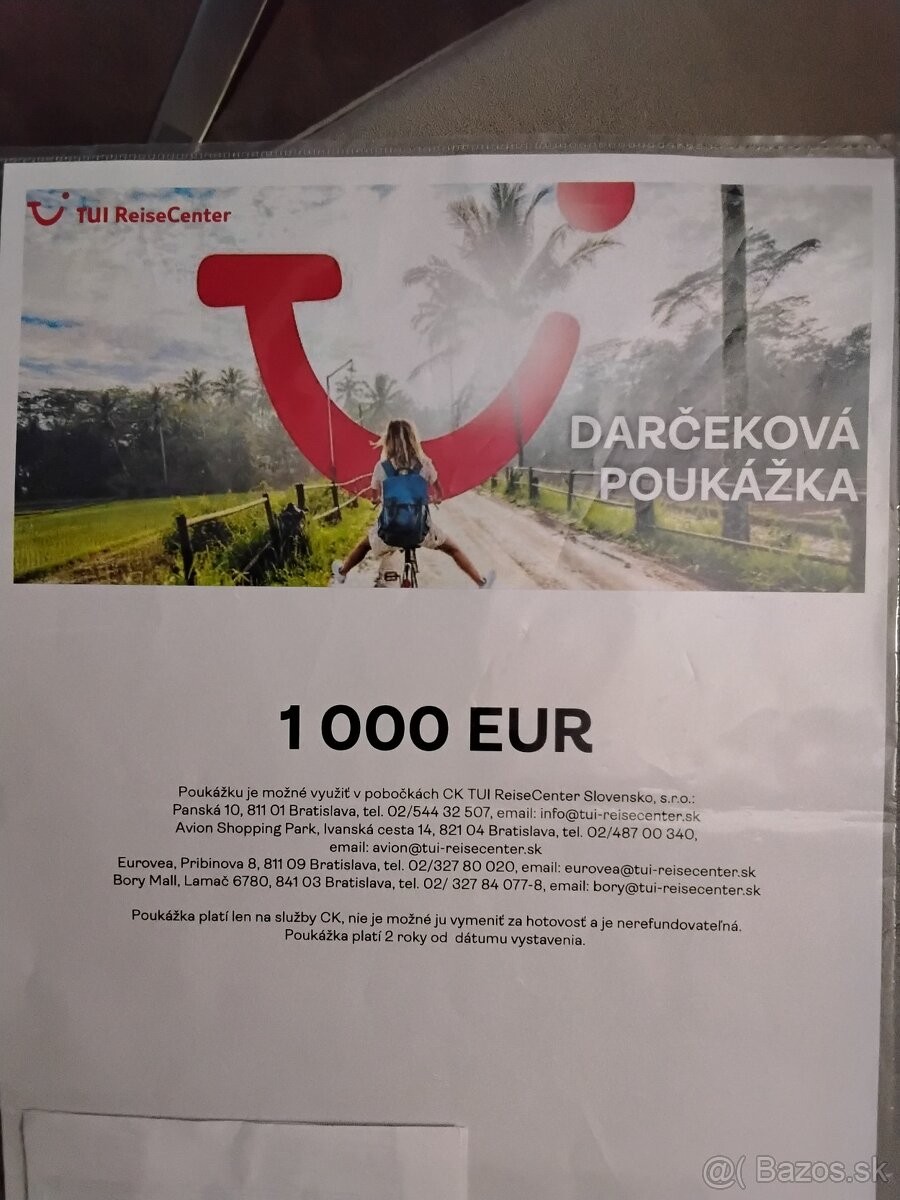 Predam darcekovu poukazku cestovnej kancelarie TUI raisen v hodnote 1000 euro za 800euro,platna do 3.12.2027 ,Trnava