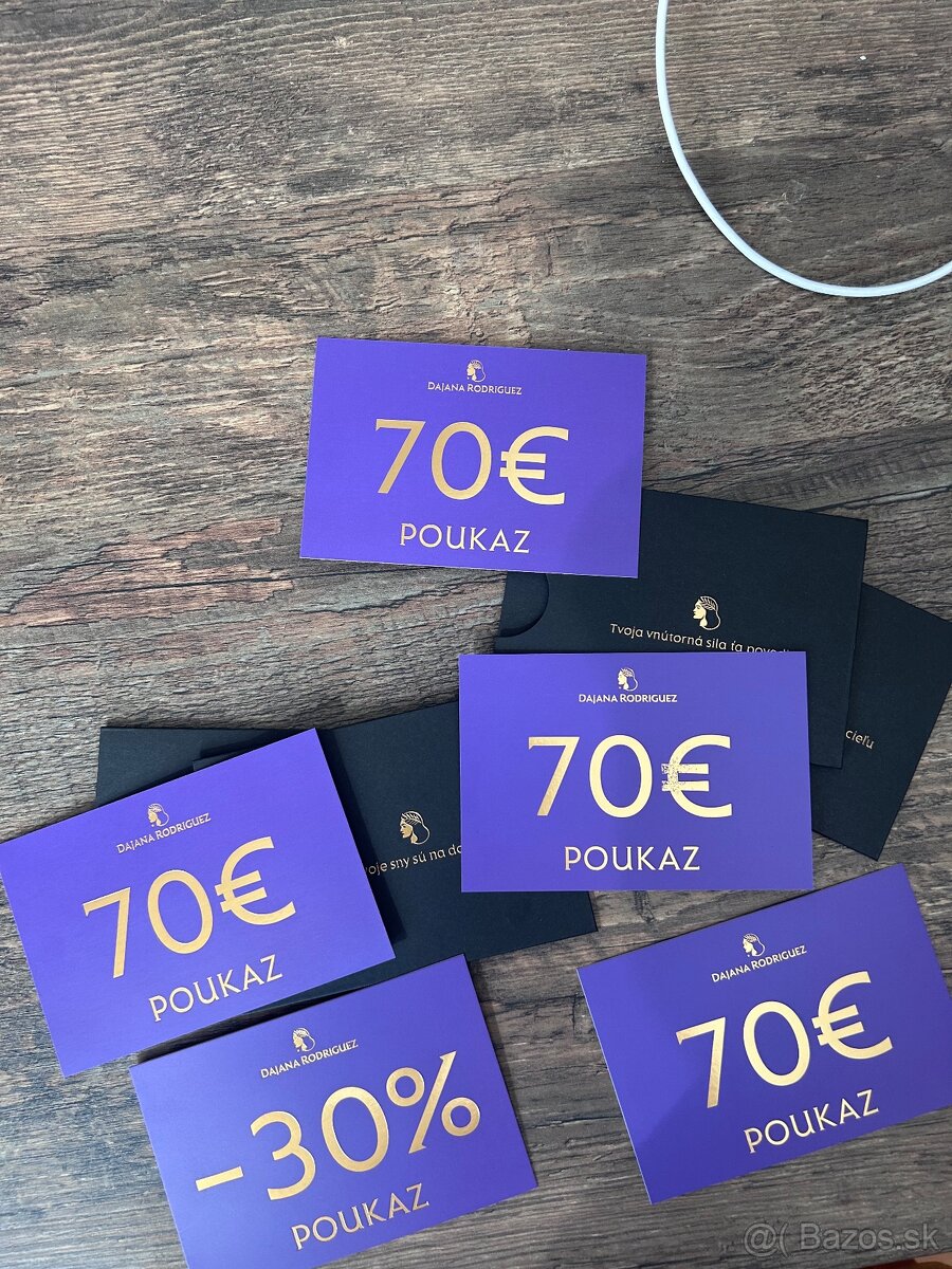 Predám nákupné poukážky na nákup v DAJANA RODRIGUEZ v hodnote 70 eur a jedna 30% zľava. Platnosť do 23.4.2026. predám za 10€ jednu