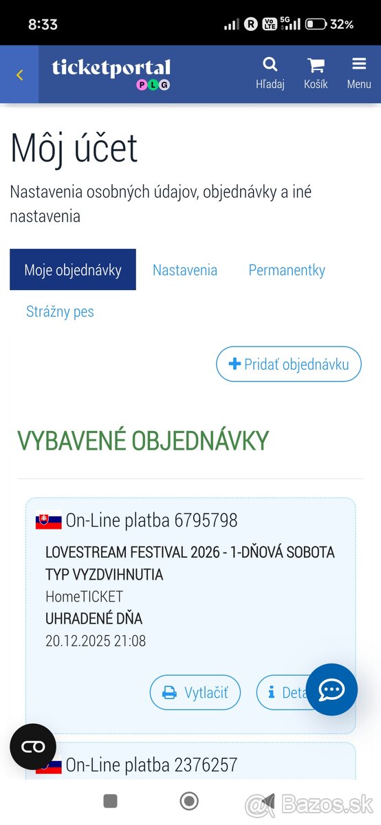 LOVESTREAM Festival 2026 - [21.3. 2026]Predám 2 celofestivalové vstupenky na festival lovestream 2026, sú to originálne lístky s hologramom kupované cez ticketportal. Osobný odber možný v Žiline, cena za 1 lístok 140€, za oba spolu 270€.